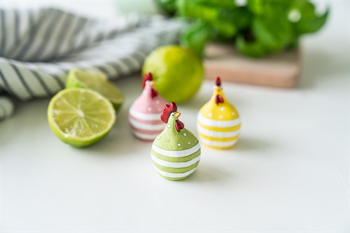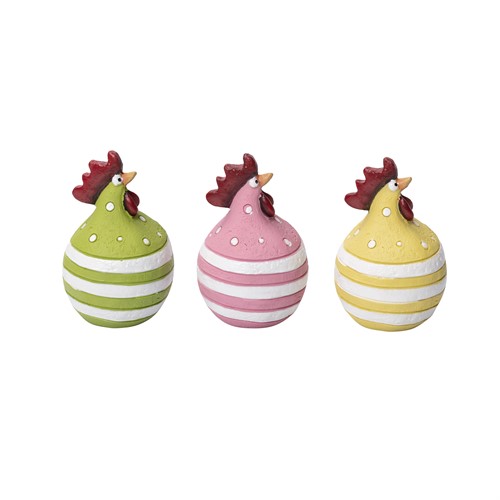 En mixad trio med små hönor i påskens klassiska färger, här varvas oregelbundna ränder och prickar på kul sätt. Avvikelser på produkt och bild kan förekomma då varje höna är handmålad.