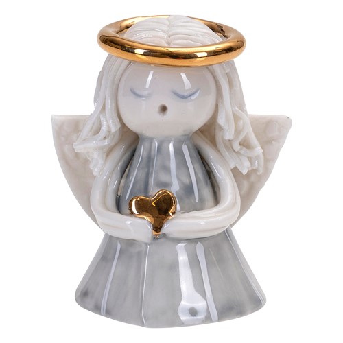 Tillverkad i vitt porslin med präglade vingar och fina handmålade detaljer i guld. Varje ängel är handgjord vilket gör dem alla unika.