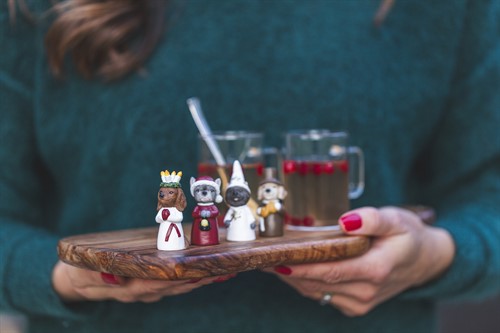 Golden retriever Stella, chow chow Sigge, taxen Ludde och den franska bulldoggen Frank deltar i årets luciatåg. Den 13 december, på Luciadagen, fylls våra hjärtan med ljuv musik och gnistrande ljus. Luciatåget är handmålat, vilket gör dem alla personliga och unika.